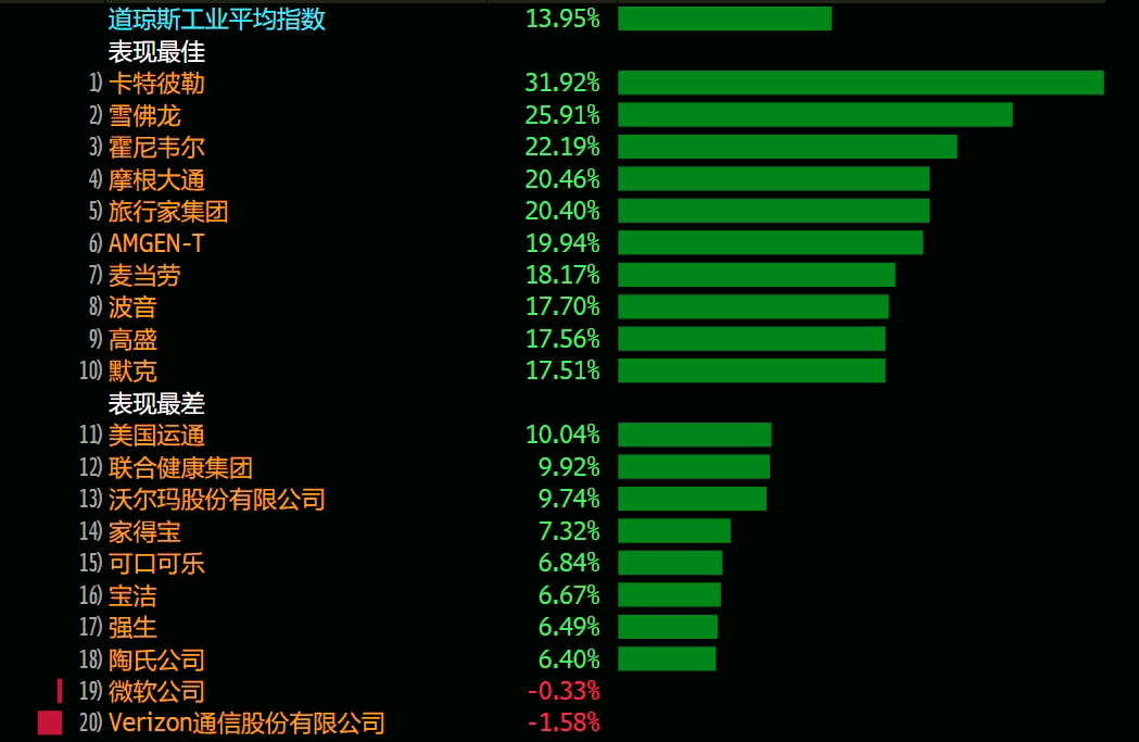 Of the 30 companies in the Dow, only$Microsoft(MSFT)$And$Verizon(VZ)$ have negative returns.