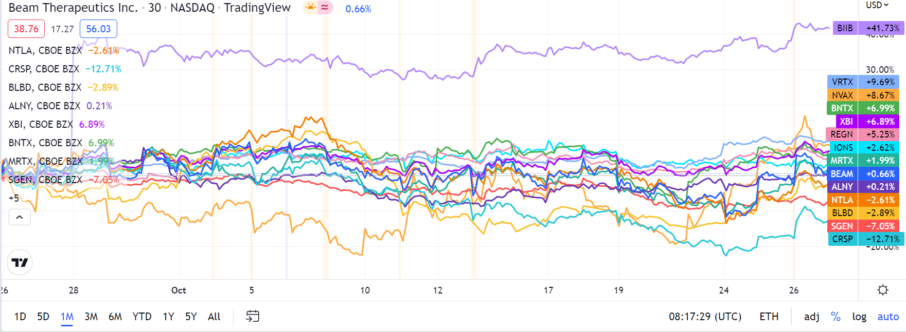 $Biogen(BIIB)$ ,$Vertex Pharmaceuticals(VRTX)$ ,$Novavax(NVAX)$ ,$BioNTech SE(BNTX)$ ,$XBI(XBI)$ ,$Regeneron Pharmaceuticals(REGN)$ ,$Ionis Pharmaceuticals(IONS)$ ,$Mirati Therapeutics(MRTX)$ ,$Beam Therapeutics, Inc.(BEAM)$ ,$Alnylam Pharmaceuticals(ALNY)$ ,$Intellia Therapeutics(NTLA)$ ,$Blue Bird(BLBD)$ ,$Seagen(SGEN)$ ,$CRISPR Therapeutics AG(CRSP)$ .