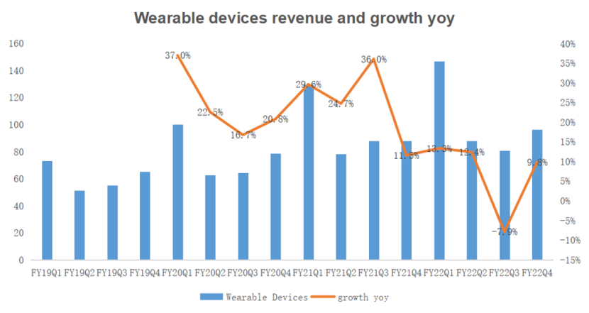 • Wearable device revenue of $9.65 billion, up 9.8% yoy, greatly exceeding Bloomberg's estimate of $8.8 billion.