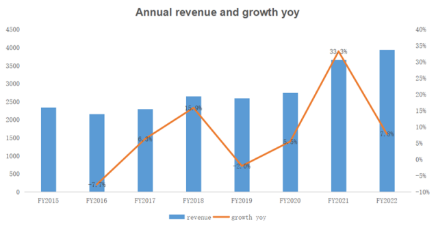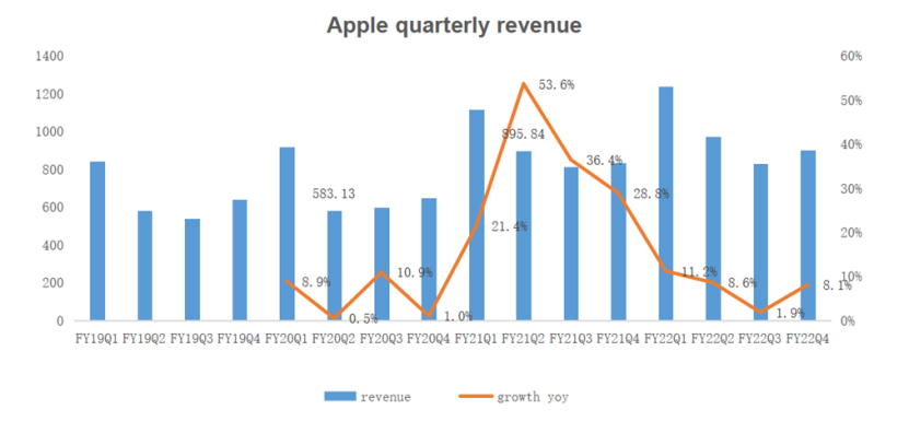 Referring to Apple's growth rate in previous years, the high growth rate of 33% in FY2021 is difficult to maintain, and the growth rate of 7.8% in FY2022 is the norm.