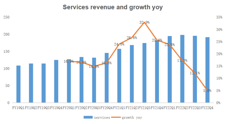 The 5% was a significant slowdown from the previous 2-digit growth. Apple's service revenue is primarily subscriptions, advertising and fees. So its the growth is dependent on hardware growth and user willingness.