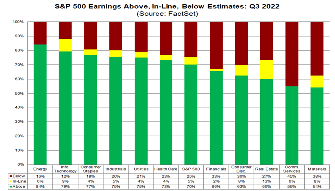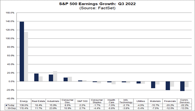 Overall, 85% of the companies in the S&P 500 have reported actual results for Q3 2022 to date. Of these companies, 70% have reported actual EPS above estimates, which is below the 5-year average of 77% and below the 10-year average of 73%. In aggregate, companies are reporting earnings that are 1.9% above estimates, which is well below the 5-year average of 8.7% and well below the 10-year average of 6.5%.