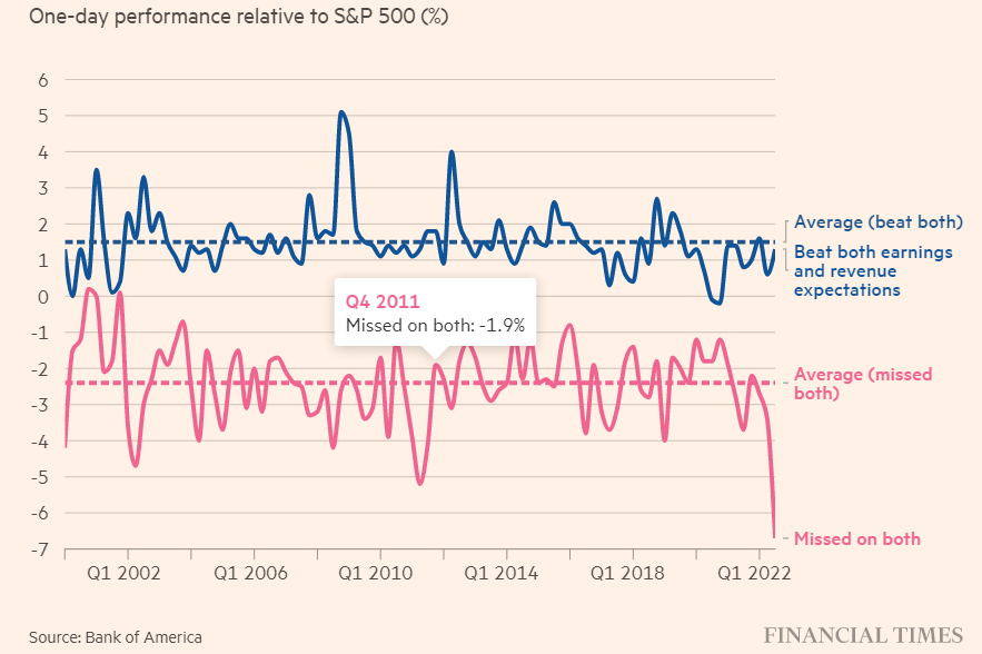 Groups that revealed sales and profits that were weaker than analysts had anticipated underperformed the blue-chip $S&P 500(.SPX)$ by 6.7% in the day following the release of their figures, according to Bank of America. It said the decline was the largest on record and much sharper than the average fall in previous years of 2.4%.
