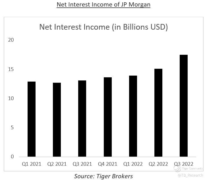 JP Morgan is largely a consumer bank. It derives net interest income from loan interest rates offset by the fees paid to depositors.Net interest income for JP Morgan rose to a record high of $17.6 billion. In a recognition of the higher interest rate environment, the bank has raised its guidance by expecting FY22 net interest income to be $66 billion.
