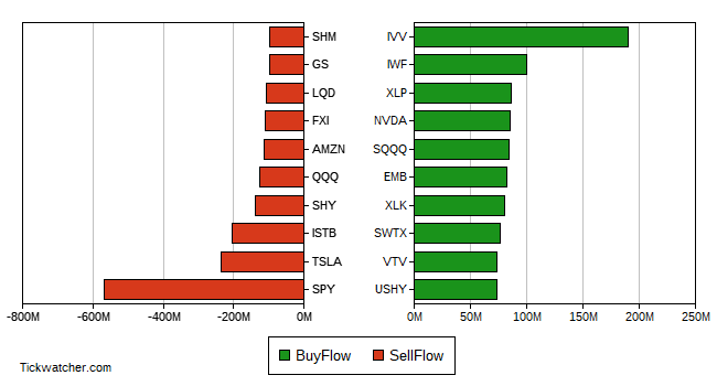 Below are top inflows (Green) and Top outflows(red) tickers.Top inflows: $iShares S&P 500 ETF(IVV)$ ,$iShares Russell 1000 Growth ETF(IWF)$ ,$Consumer Staples Select Sector SPDR Fund(XLP)$ ,$NVIDIA Corp(NVDA)$ ,$Nasdaq100 Bear 3X ETF(SQQQ)$ ,$iShares JP Morgan USD Emerging Markets Bond ETF(EMB)$ ,$Technology Select Sector SPDR Fund(XLK)$ ,$SpringWorks Therapeutics, Inc.(SWTX)$ ,$Vanguard Value ETF(VTV)$ .