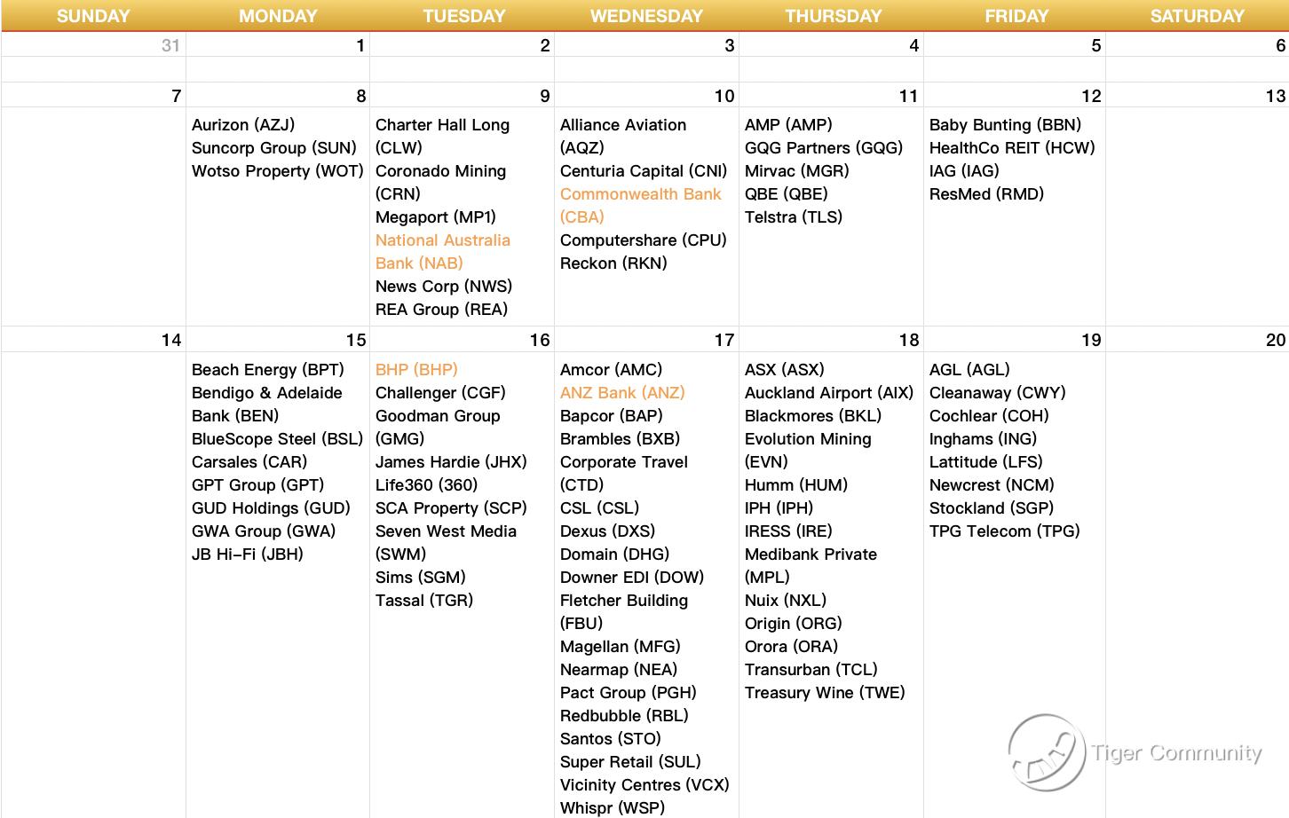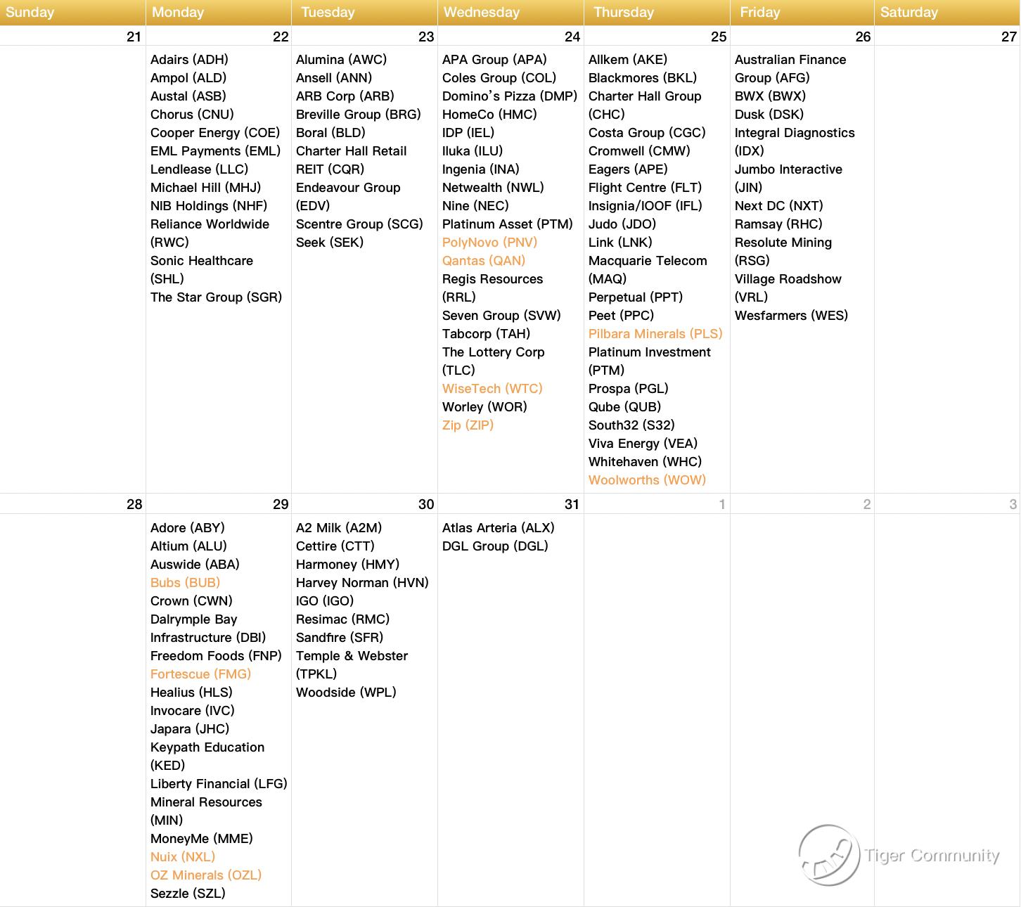 The calendar below, which we will update throughout, shows the AU companies most held and actively traded by Tigers that report results in the period.☀️Here is what you need to do