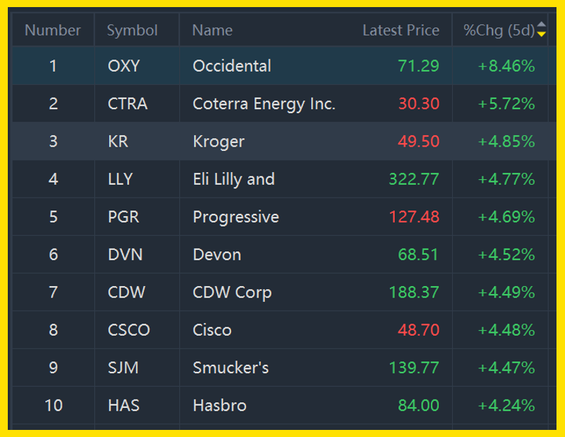 $Occidental(OXY)$ ,$Coterra Energy Inc.(CTRA)$ , $Kroger(KR)$ ,$Eli Lilly and(LLY)$ ,$PG&E Corp(PCG)$ , $Devon(DVN)$ , $CDW Corp(CDW)$ , $Cisco(CSCO)$ , $Smucker's(SJM)$ , $Hasbro(HAS)$ .