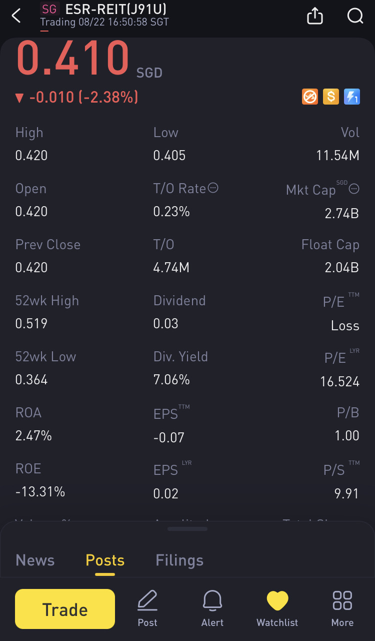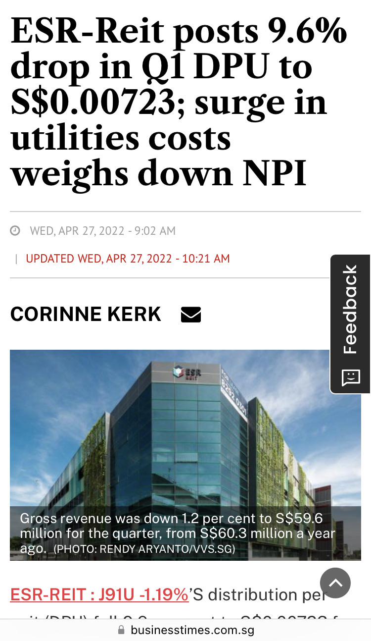 My Summary: sometimes no matter how try best to pick the stocks, the outcome not as per i expect, the dip more than the dividend [Spurting] the Dividend yield still looks attractive though. Just that due to interest hike, covid, dampened the demand/interest for REITS, it doesn't look as attractive anymore, so the existing investor may also sell/exit due to less demand price continue to slide.