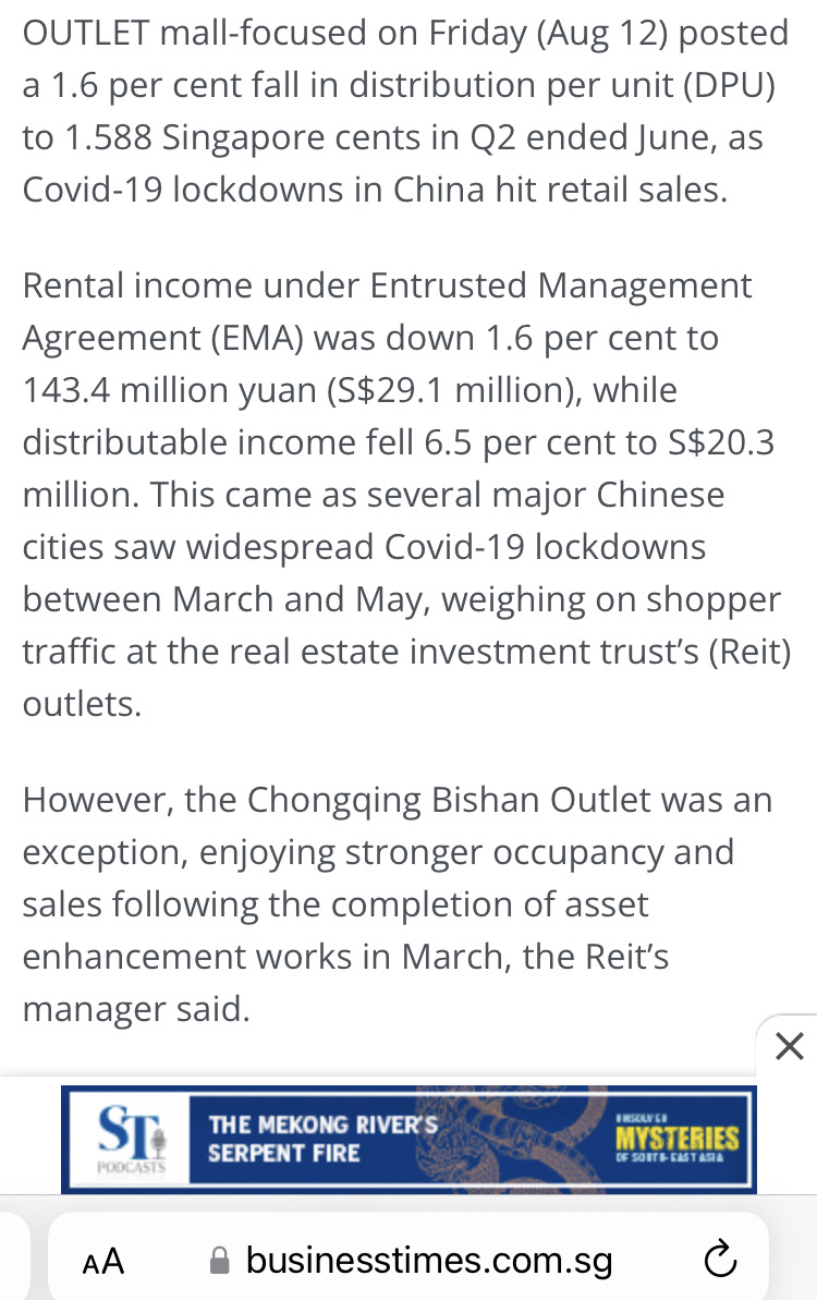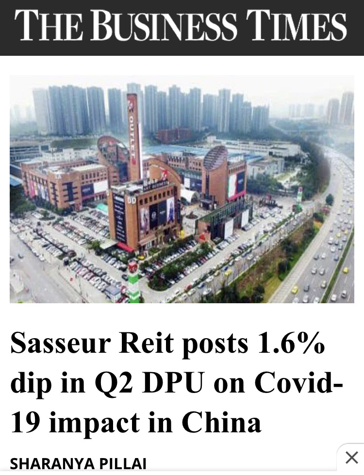 $SASSEUR REIT(CRPU.SI)$DPU dip due to lock down in China, so fair enough if price dip. however Chongqing Bishan outlet strong occupancy and sales, got hope ! [Happy]