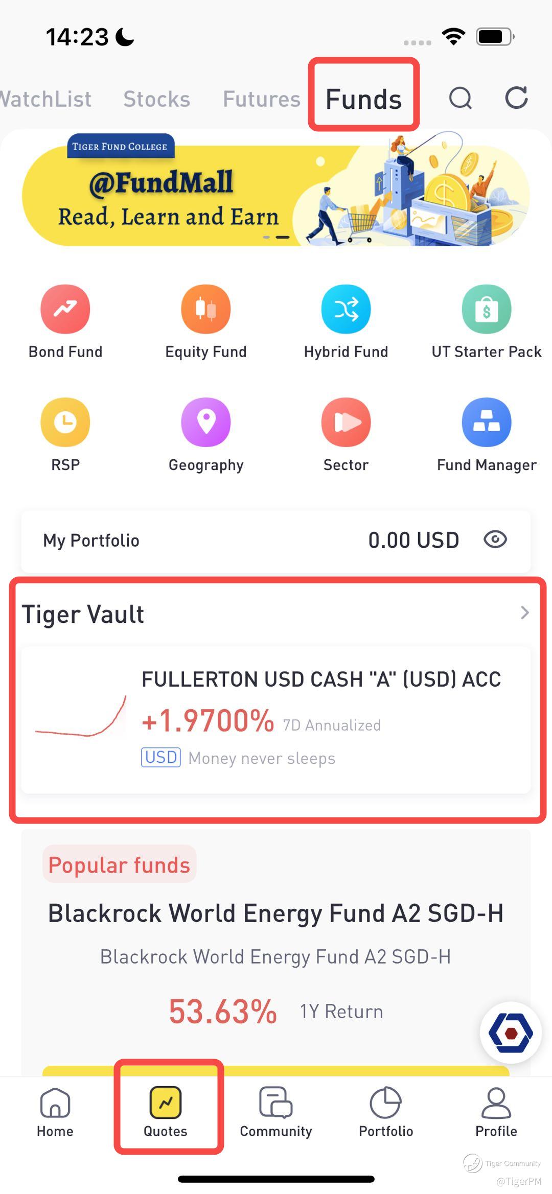 - From the “Tiger Vault” module on the Home page/Funds page, click to enter the Tiger Vault homepage: