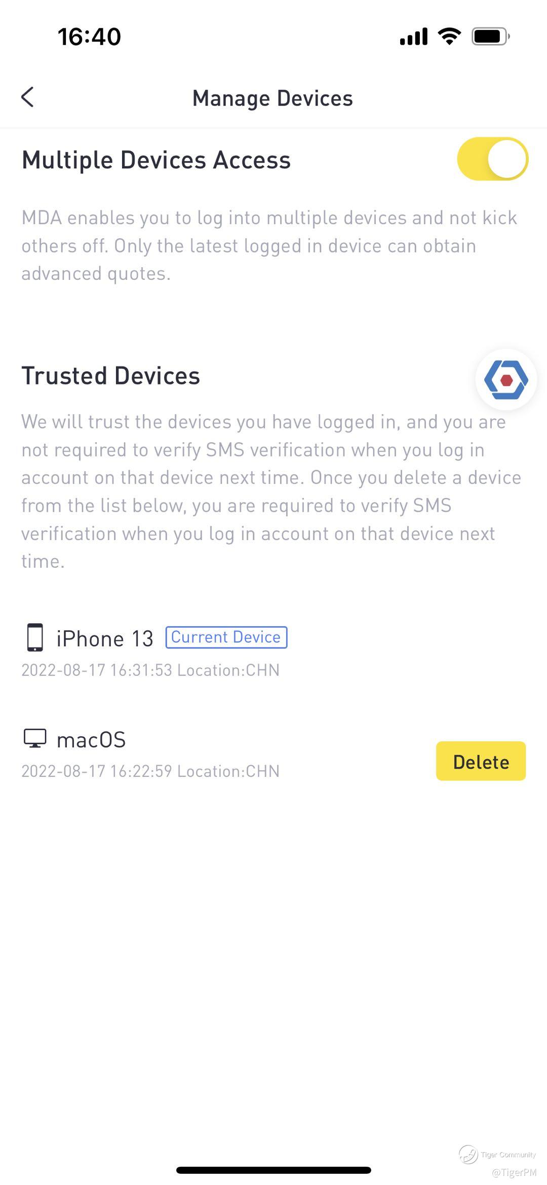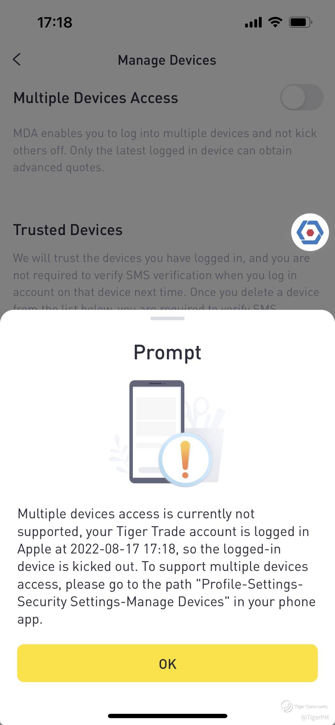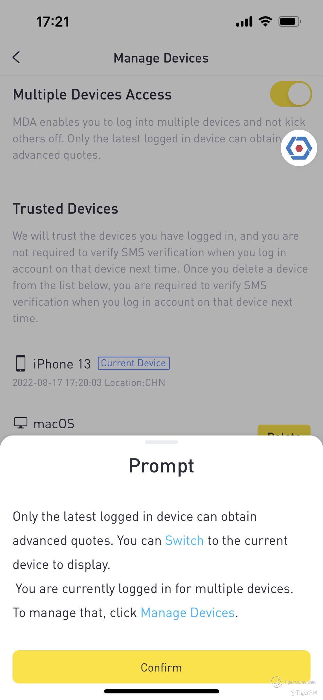 - When Multiple Devices Access is turned on, only the latest login device can access the advanced market quotations; the user can switch the device to obtain the quotations through the blue text button and perform multi-device login management