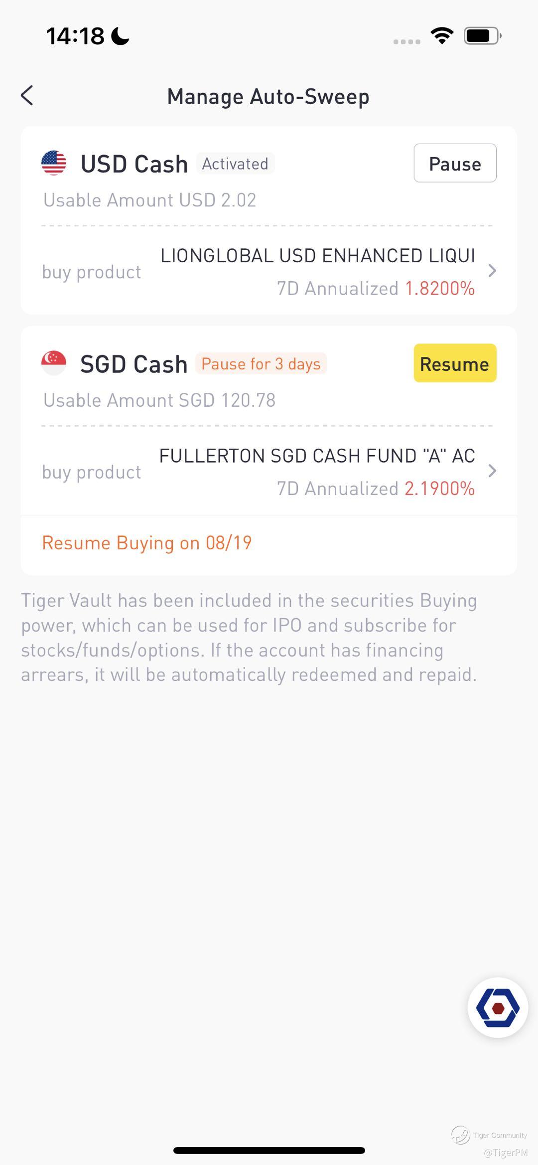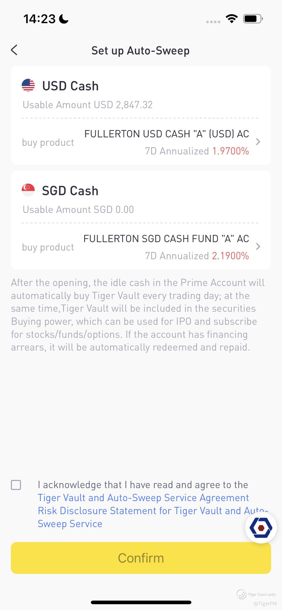 - Auto-Sweep function: After the user turns on the Auto-Sweep function, the system will automatically use your idle funds in the Prime Account to buy into the Tiger Vault, which aims to generate additional income; But when the user wishes to buy stocks/options/funds/IPO, the Tiger Vault value will be included in the cash Buying Power of the account, which should not affect customer transactions, and the system will automatically complete the redemption and purchase.