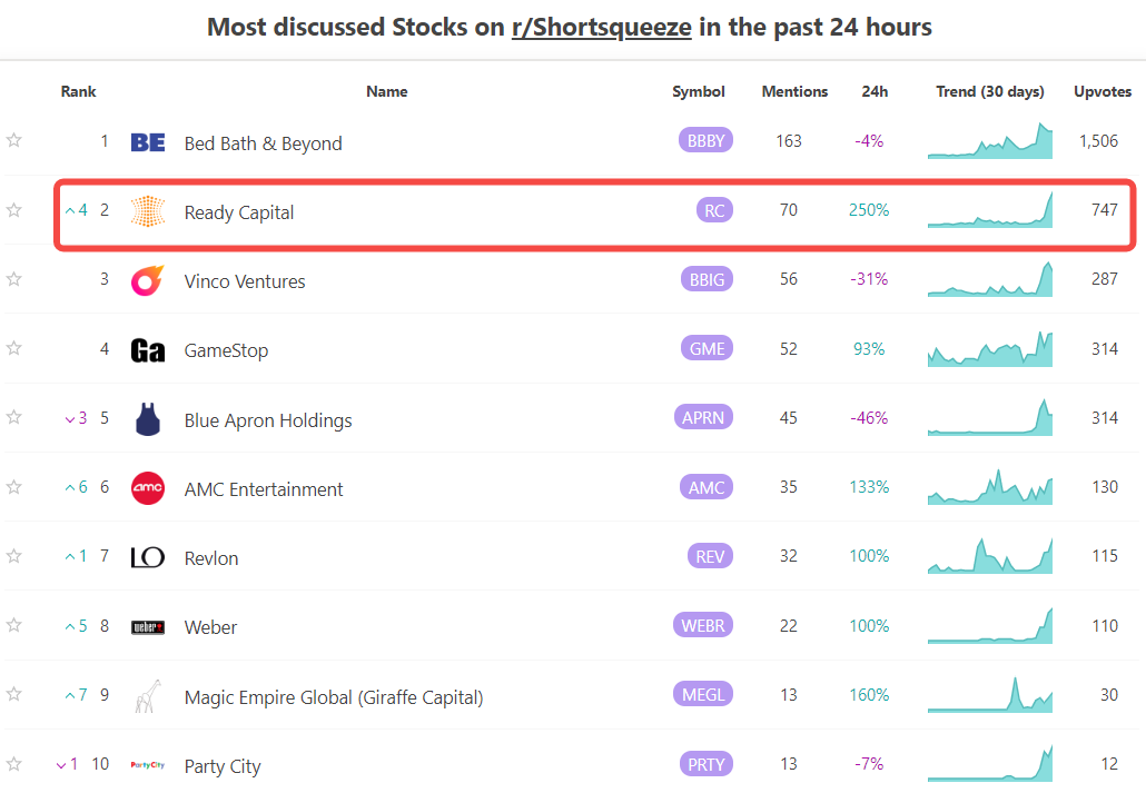 The website shows $Ready Capital Corp(RC)$ upvotes increased 250% in last 24 hrs.